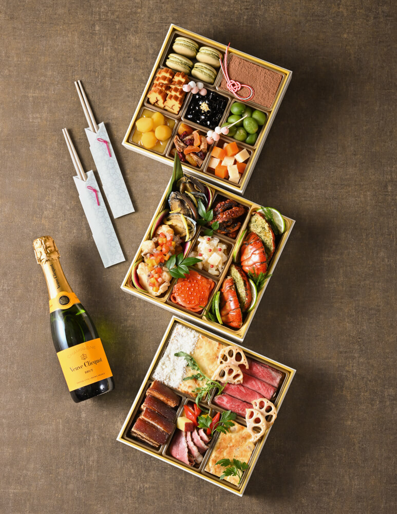 おせちには、お祝いにふさわしい「ヴーヴ・クリコ」のハーフボトルをご用意します。 洋風おせちと相性抜群のシャンパンがカウントダウンや、新年の贅沢な朝のひとときに華を添えます。また、ご希望のお客様はノンアルコールドリンクへの変更を承ります。